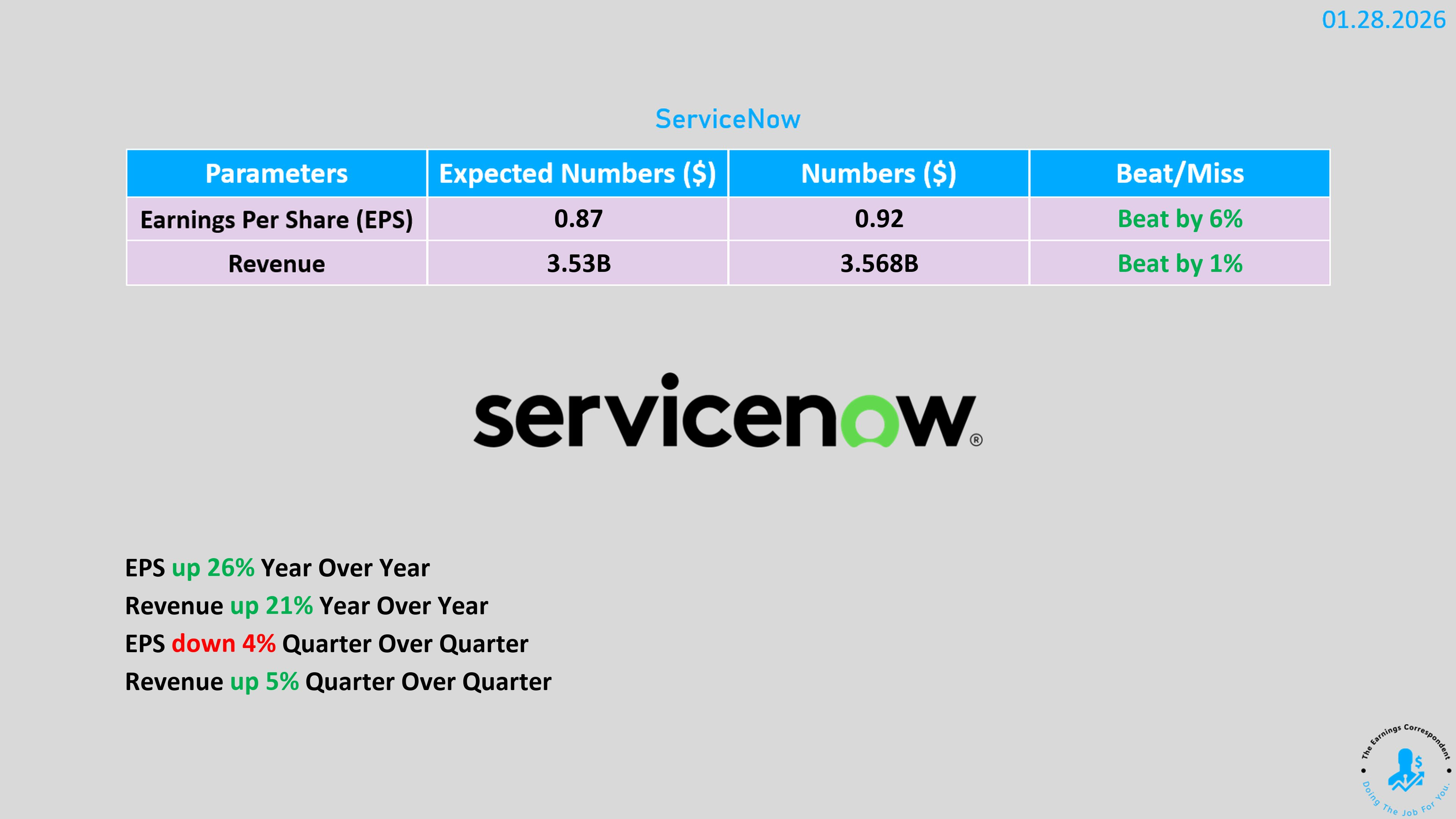 NOW had a double beat and raise this Quarter: EPS up 26% and Revenue up 21%.