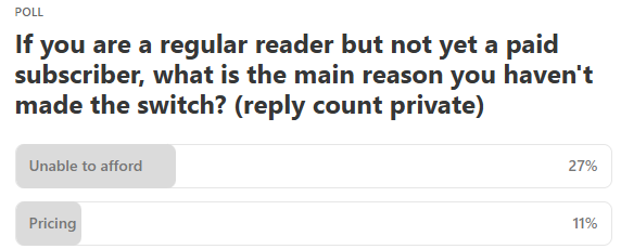 This week, I sent out a poll to readers and I appreciate everyone that gave feedback. There is still time if you haven’t. I would appreciate you taking 1 minute of your time to contribute to the direction of this substack!